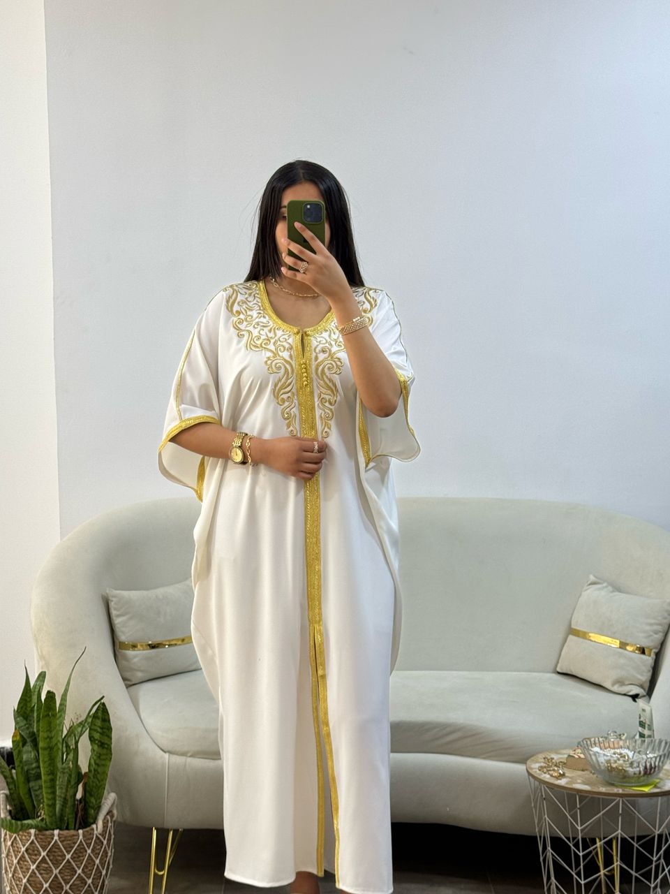 Élégante et raffinée, cette robe d’hôtesse (Djeba) noire incarne le charme intemporel. Confectionnée avec une attention minutieuse aux détails, elle est sublimée par une broderie délicate en fil doré, apportant une touche luxueuse et sophistiquée. Sa coupe élégante épouse parfaitement la silhouette, offrant une allure distinguée en toutes circonstances. Idéale pour les réceptions, soirées et événements où l’élégance est de mise.